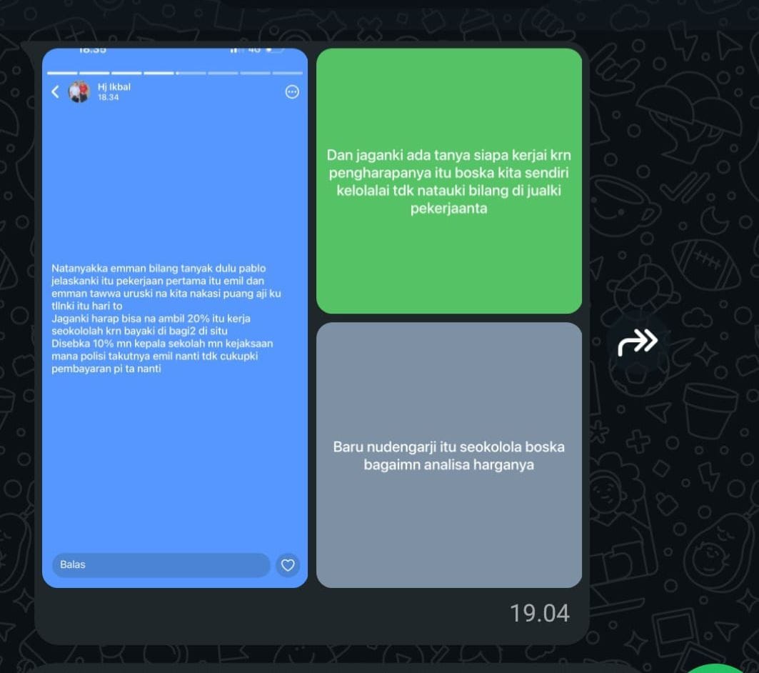 Dalam salah satu gambar tangkapan layar terlihat isi pesan yang mengarah pada pembagian fee bernilai 10–20 persen untuk berbagai pihak, mulai dari kepala sekolah, kejaksaan, hingga kepolisian.